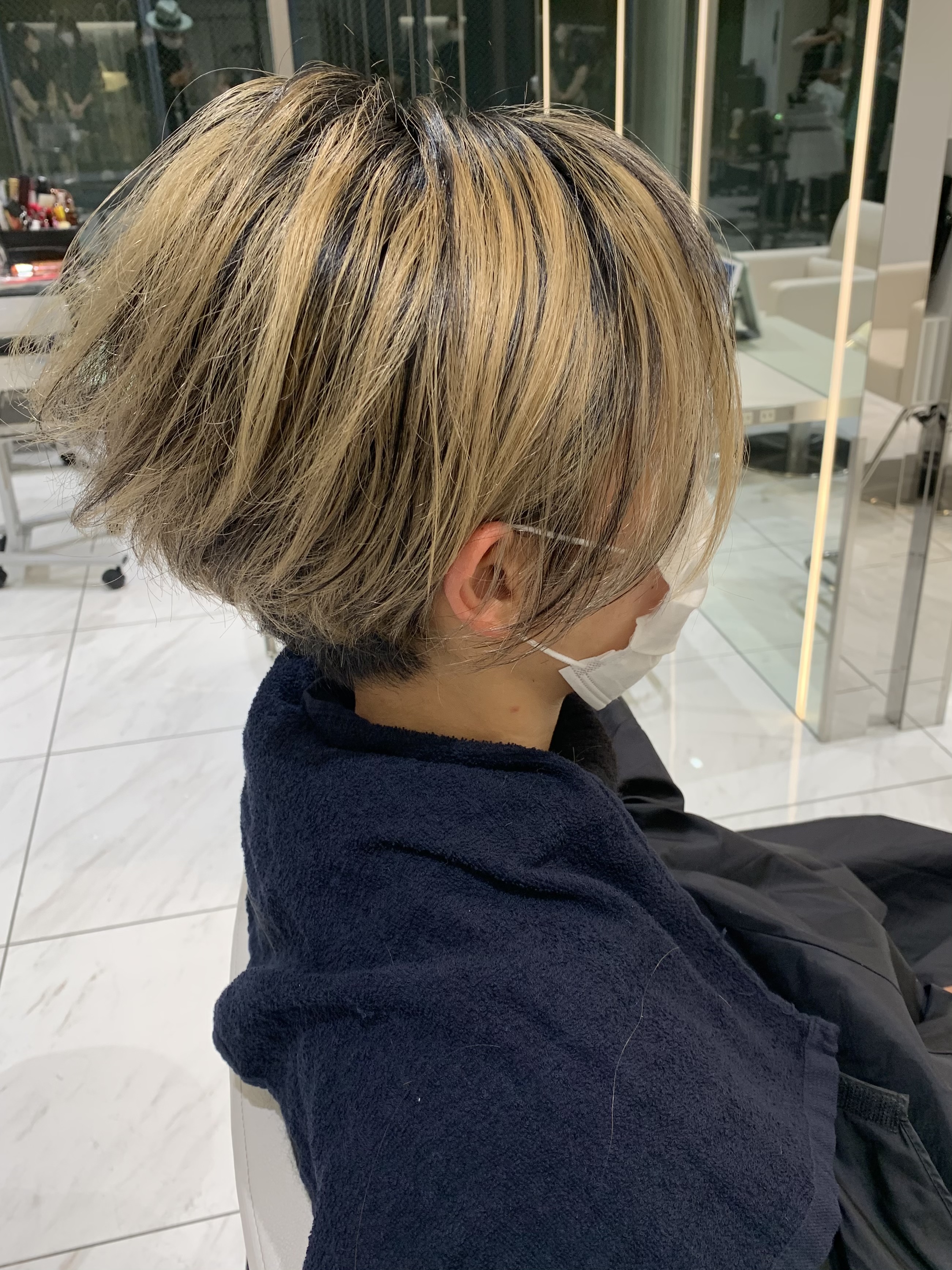 と、遠慮なく切らせていただきました。カラーも根元が良い感じに伸びててこれを活かしてローライトを入れ動きが強調されるスタイルにさせていただきました。